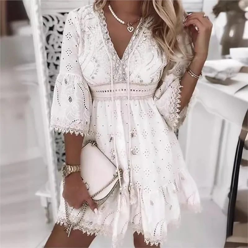 El encantador vestido blanco de estilo ibicenco "Karol" presenta delicados bordados, mangas acampanadas y un escote en V decorado con detalles de encaje. Con un diseño bohemio y elegante, es perfecto para eventos al aire libre y ocasiones especiales. La falda fluida y el ajuste cómodo garantizan un look sofisticado y relajado.