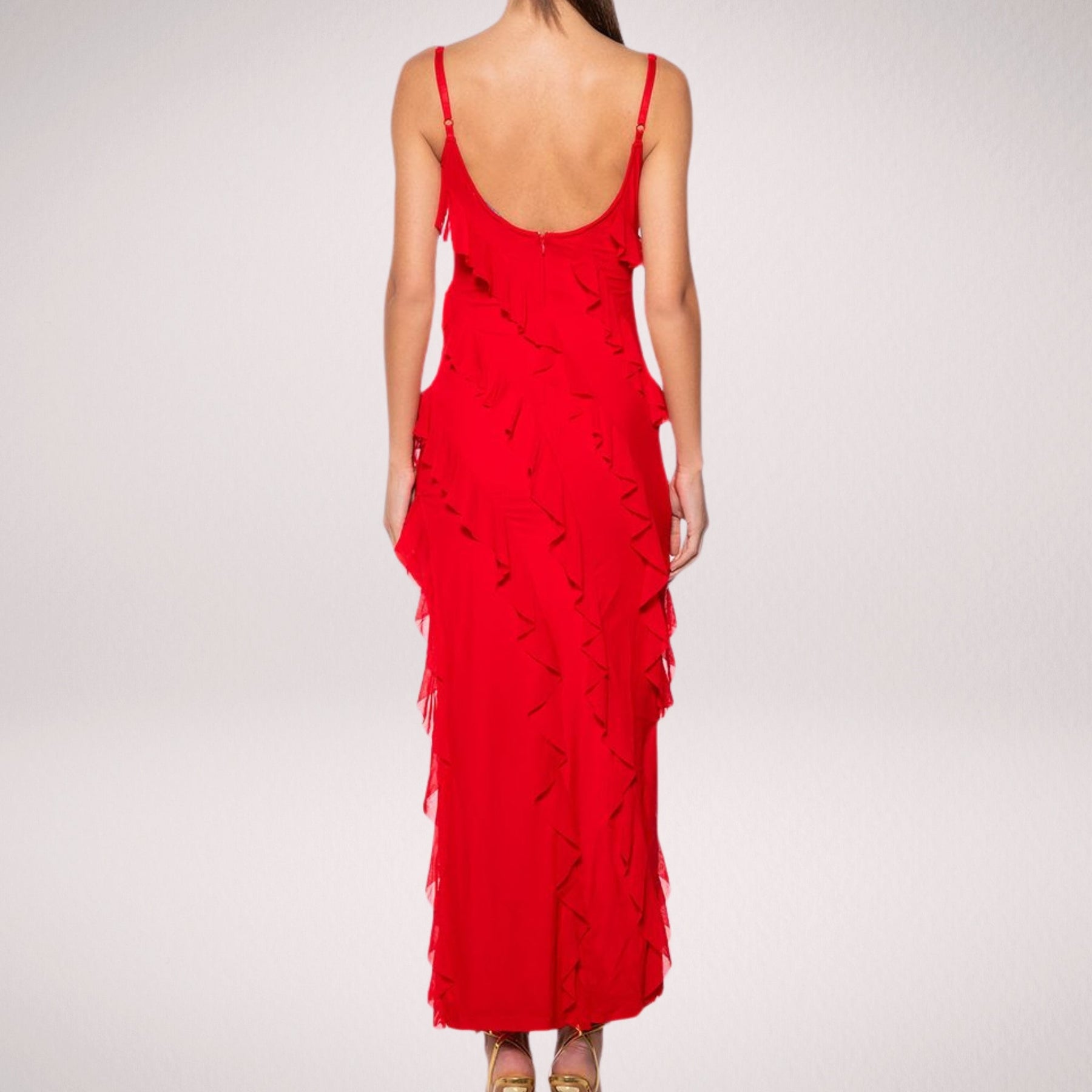 El vestido cuenta con un diseño de doble capa, compuesto por una delicada capa exterior de tejido translúcido que aporta un toque etéreo, y un forro interior de tela ligera que garantiza comodidad y cobertura.
